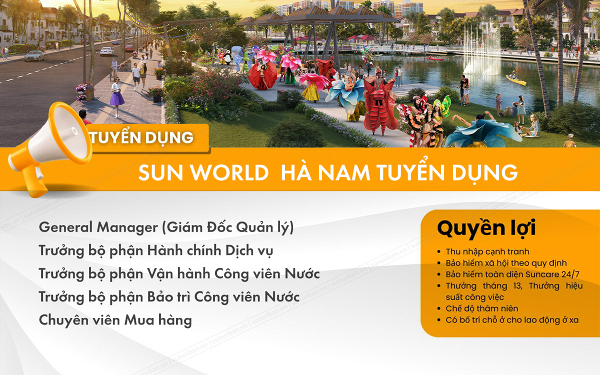 Với tầm nhìn mở rộng và phát triển hệ thống tổ hợp vui chơi giải trí hàng đầu tại Hà Nam, Sun World Hà Nam trân trọng thông báo tuyển dụng các vị trí quan trọng, mang đến cơ hội nghề nghiệp hấp dẫn cho các ứng viên tiềm năng. Chúng tôi hân hạnh mời bạn tham gia ứng tuyển cho những vị trí sau: